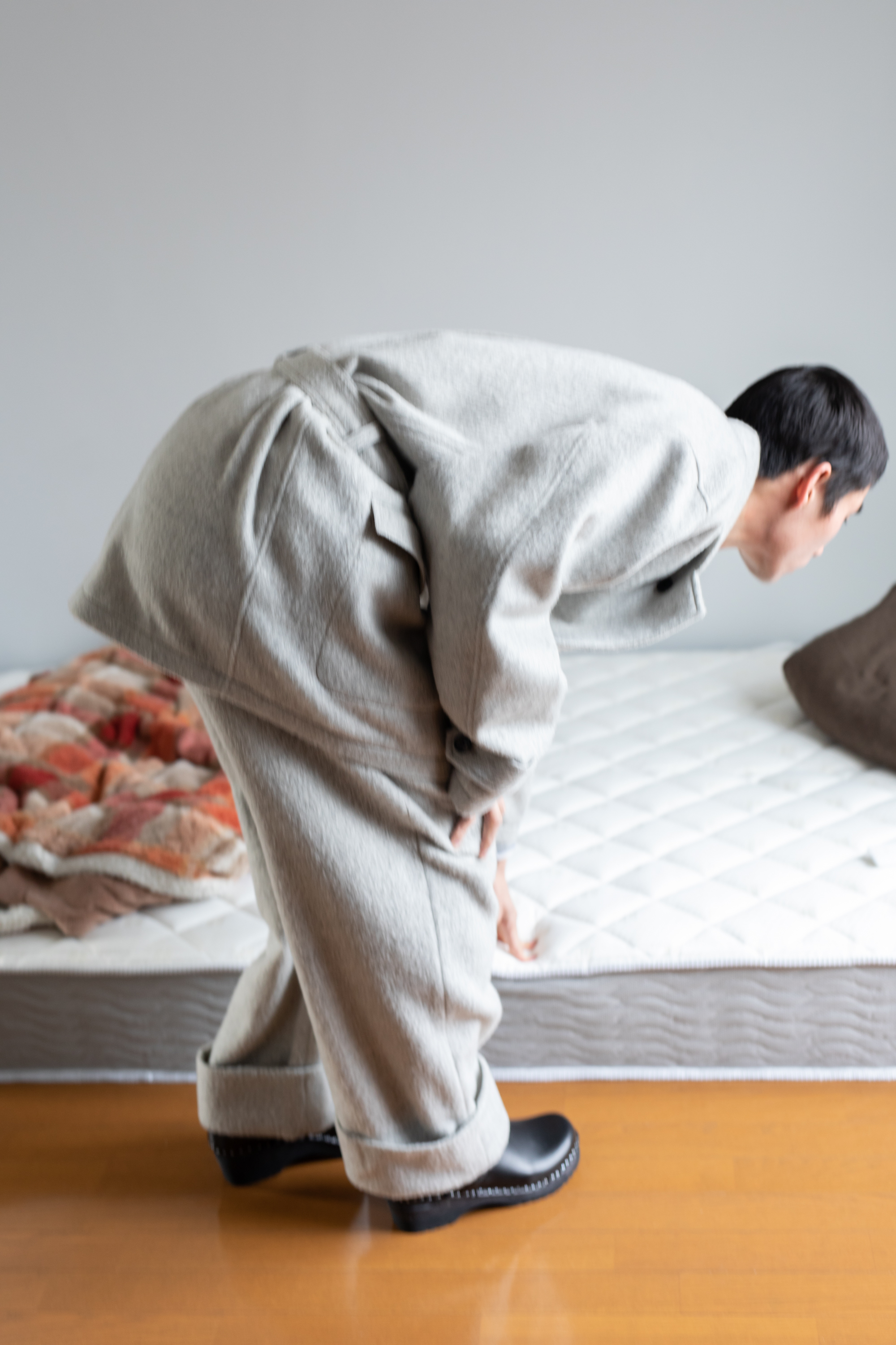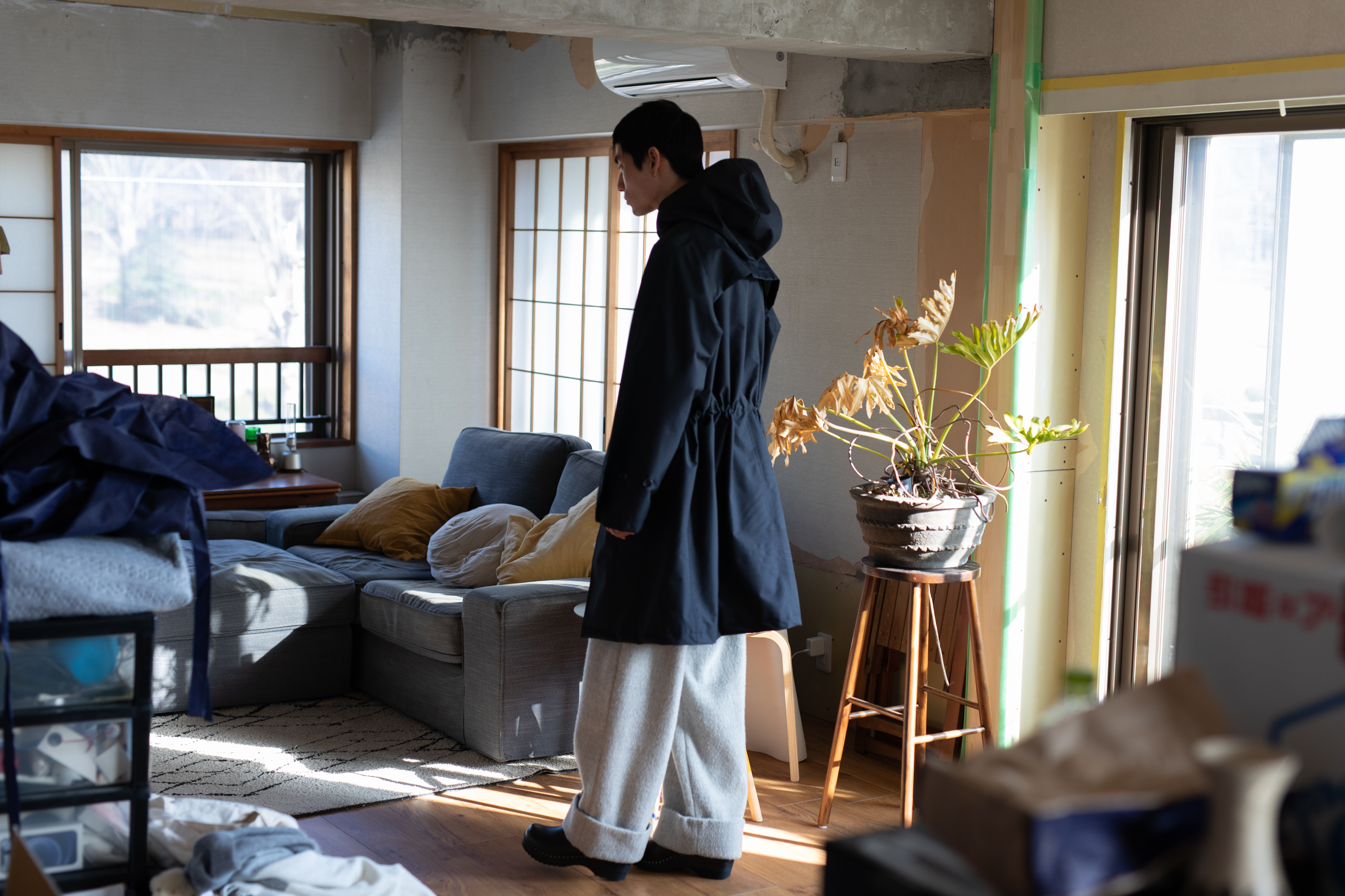 We visited twelve different homes in Tokyo and took photographs there so that we could mix the elements of clothes that Yoshiro designed, inspired by his own memories or general memories of "nostalgia", with those places where people are making memories. This series of photographs shows the result of that experiment, but also seen as a document of the lives of twelve young people in Tokyo without their figures.