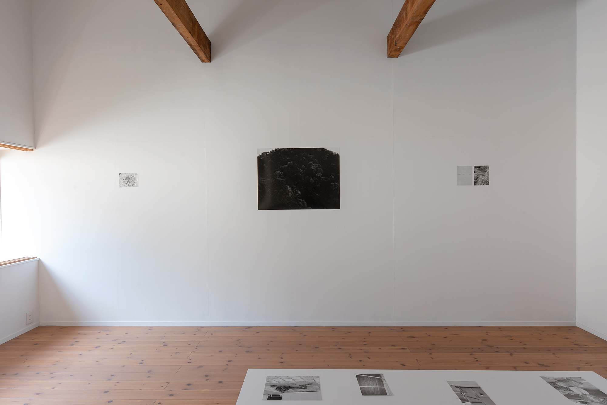 『ランドスケープ・マニュアル』では、そのシリーズに新たに写真を自在に組み合わせることで、断片と全体を行き来しながら山中の風景/イメージを想起させる試みがなされています。壁面には『あなたが風景を見るとき』からのプリントと、現地の植物相や壁面などのディテールを写した大小さまざまなイメージ6点が余白を生かして配置され、会場中央に設置されたローテーブルには、壁面のミニマルなリズムと呼応するようなバリエーションに富んだ写真が設置されています。来場者は余白が大部分を占める壁面を風景を見るように眺めつつ、天地左右さまざまな向きに写真が置かれたテーブルを覗き込むように回遊することになります。