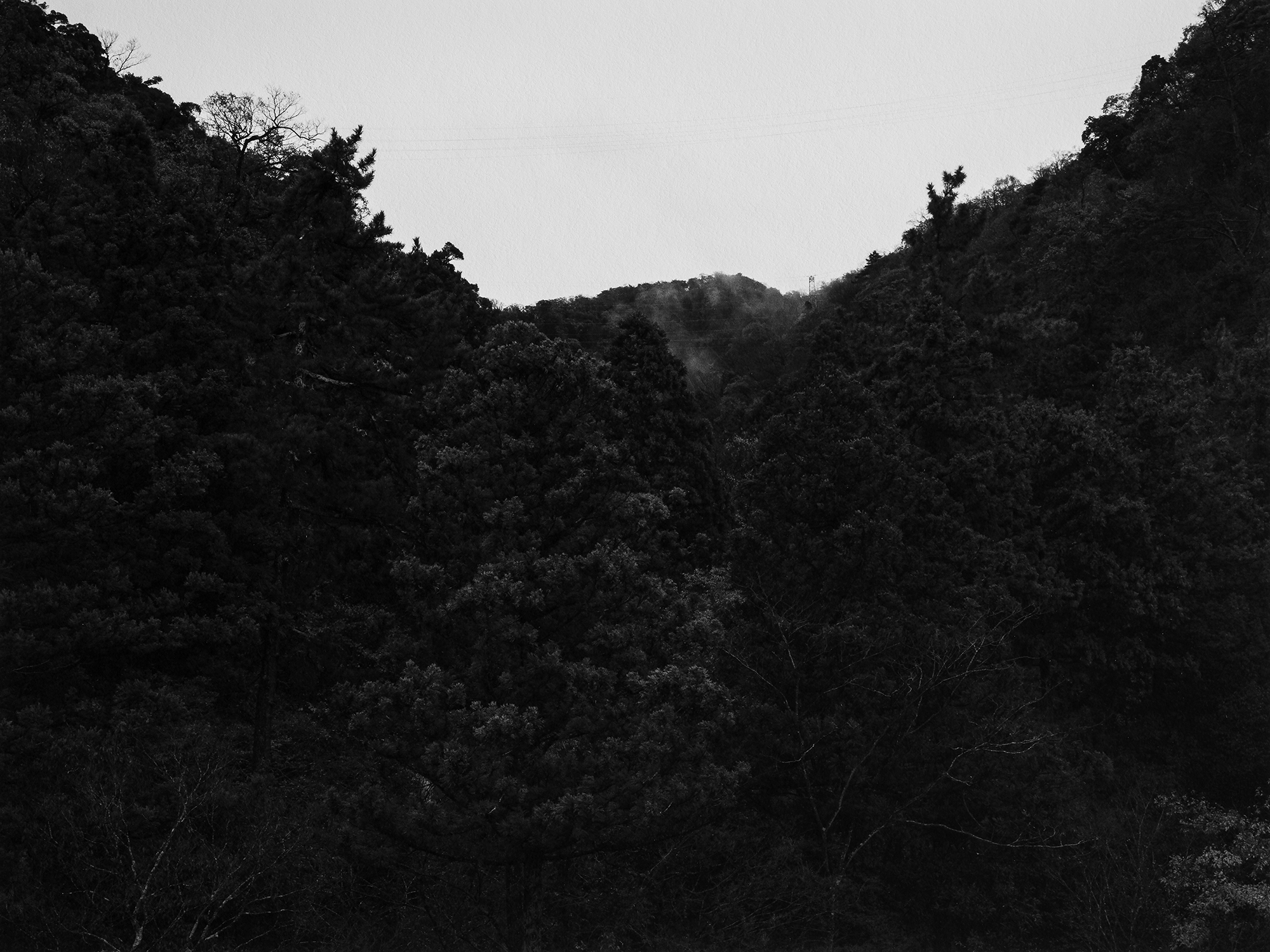 時間の流れを視覚化し、写真を静止から解放することを試みるインスタレーション。3枚のモノクロ写真は、石川県の山中温泉を訪れる観光客の多くが足を運ぶ橋の上から望む景色をとらえている。一見何の変哲もない風景写真だが、河野は撮影した写真を後日作品が設置される展示室の壁に貼り付け、自然光のもとでプリントを再撮影した。その結果、写真は雄大な山々の記録であると同時に、ある日の展示室を照らす光の記録となり、鑑賞者の視線は異なる場所と時間、そして多層的に記録された光の狭間で揺れ動くこととなる。ここで河野は、撮影された途端に過去のものになってしまう写真の在り方や、写真が物事のイメージを決定づけることにささやかな抵抗を試みている。古来より人々が目にしてきた景色は再構築され、視線を投げかけるたびに新たな風景として立ち上がるのである。